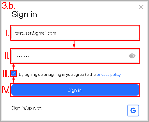 The”Sign In” window will open. - There are two ways to sign in: using a Google account or by entering email and password: