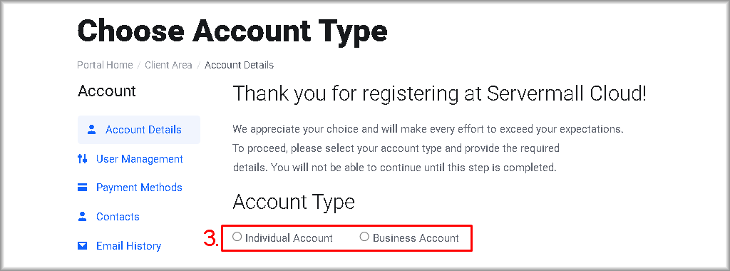 • “Individual Account” — if you plan to use Servermall Cloud services for personal purposes.