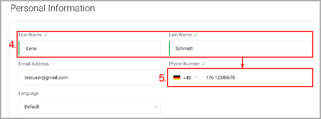 1. Enter the account holder’s first name and surname in the “First Name” and “Last Name” fields. Always enter the real name — the use of pseudonyms, fictitious names or nicknames is not allowed.
