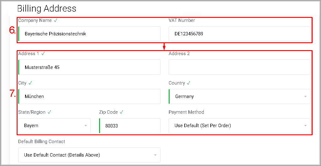 To do this, fill the “Address 1”, “City”, and “Zip Code” fields and select appropriate values in the “Country” and “State/Region” lists.