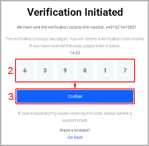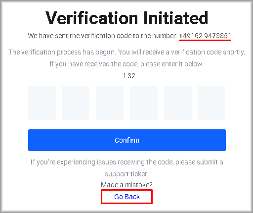 You can check the mobile phone number in the top right corner of the “Verification Initiated” window. If the number is incorrect, click “Go Back”.