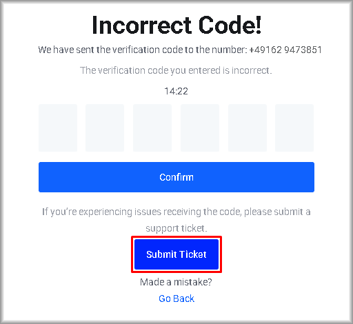 If you have made sure that the verification code is correct but verification still fails, create a support ticket by clicking “Submit Ticket” and describe the problem.