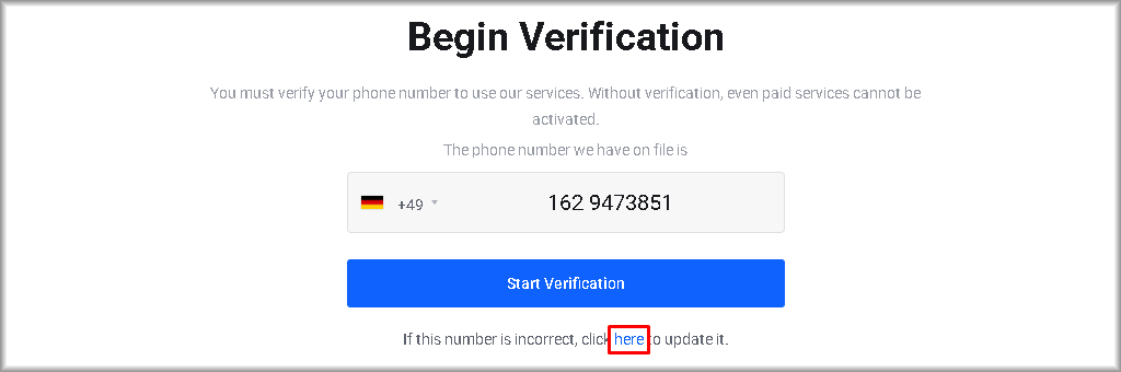 You will be redirected to the “Begin Verification” window, where you should click “Here” to correct the mobile phone number.