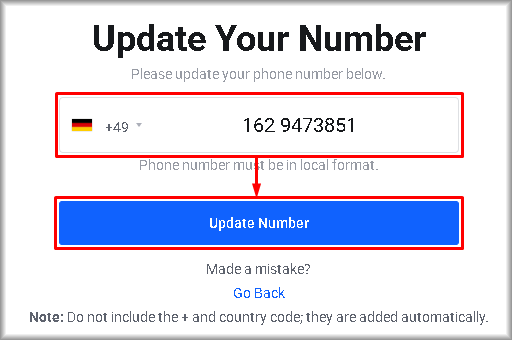 In the “Update Your Number” window, select the country code, enter the remaining digits of the mobile phone number, and click “Update Number” to save the changes.
