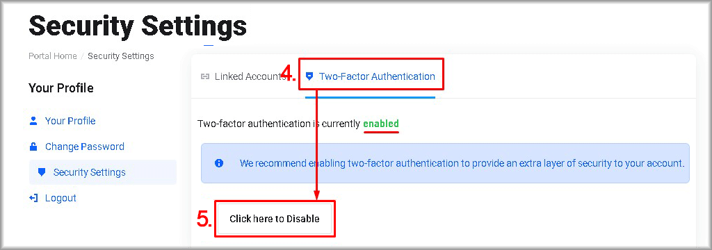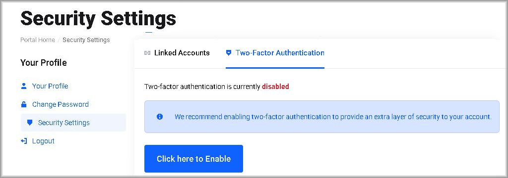 You will be redirected to the “Security Settings” page. - Go to the “Two-Factor Authentication” tab.
