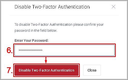 The “Disable Two-Factor Authentication” window will open. - In the “Enter Your Password” field, type your account password to confirm disabling two-factor authentication.