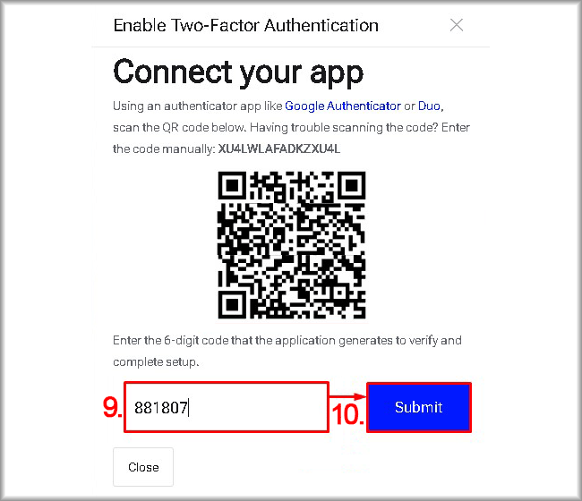 - Save or write down the code from the “Your Backup Code” field in a safe place, separate from the login and the password. This code will be needed if the two‑factor authentication application or the device it runs on becomes unavailable. In this case, you will be able to provide the code to support, and 2FA for your account will be disabled.