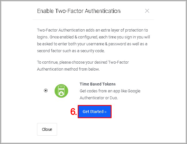 The “Enable Two‑Factor Authentication” window will open. - Click “Get started >>”.