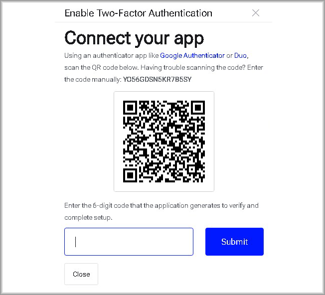 The “Enable Two‑Factor Authentication. Connect your app” window will open. A QR code for linking the 2FA application will be displayed.