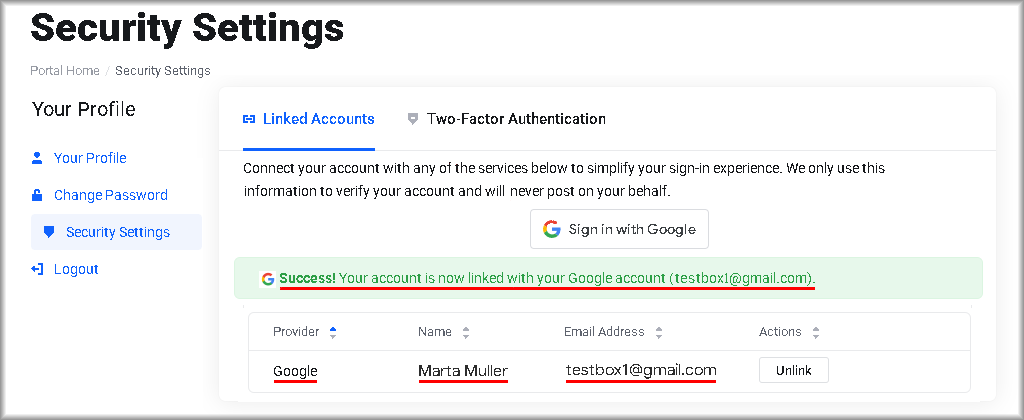 If the Google account is linked successfully, a message will appear: “Success! Your account is now linked with your Google account”, and a row for the added authentication provider will be shown.