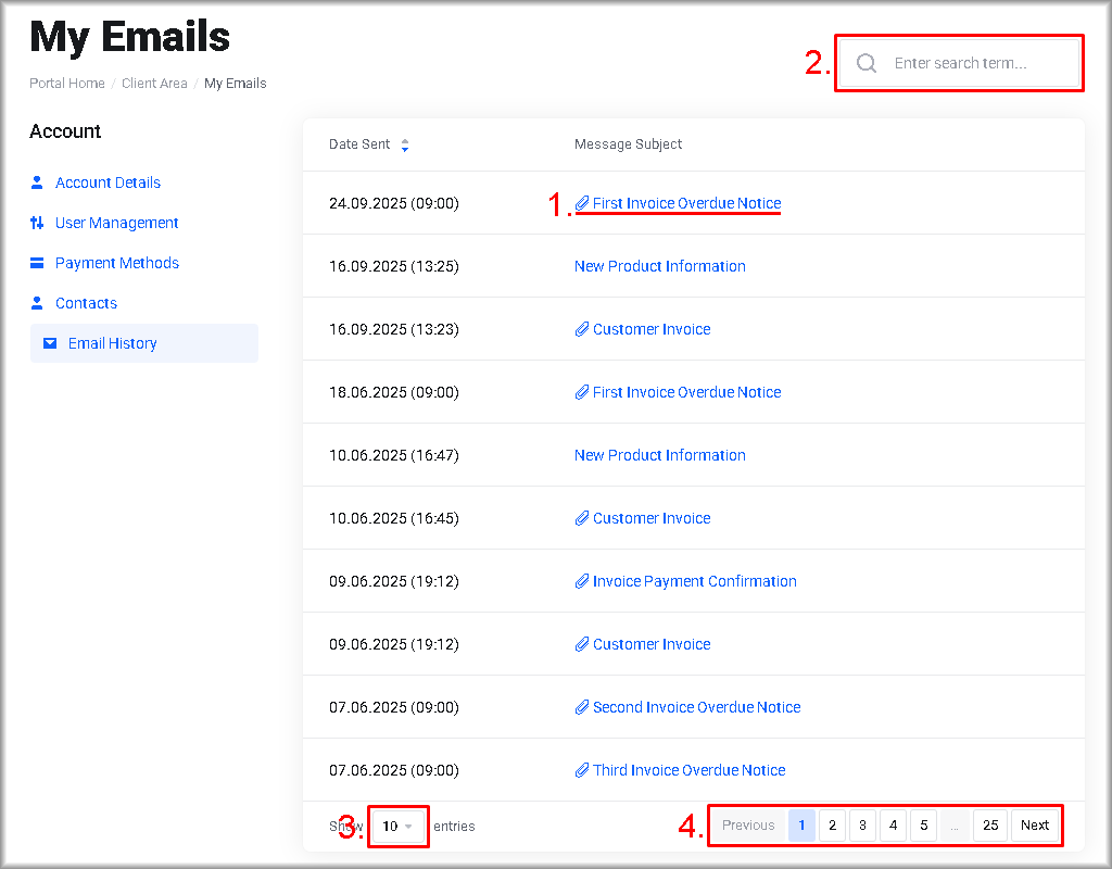 To view an email, click the subject in the “Message Subject” column. After that, a window with the email text will open. - Filter emails by subject