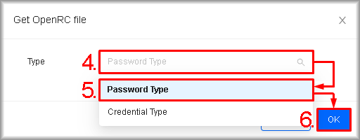 The “Get OpenRC file” window will open. - In the “Get OpenRC file” dialog, click the “Type” dropdown.