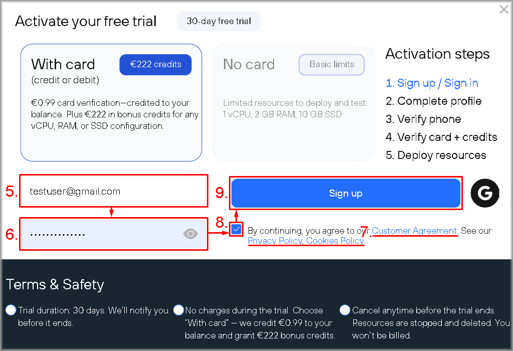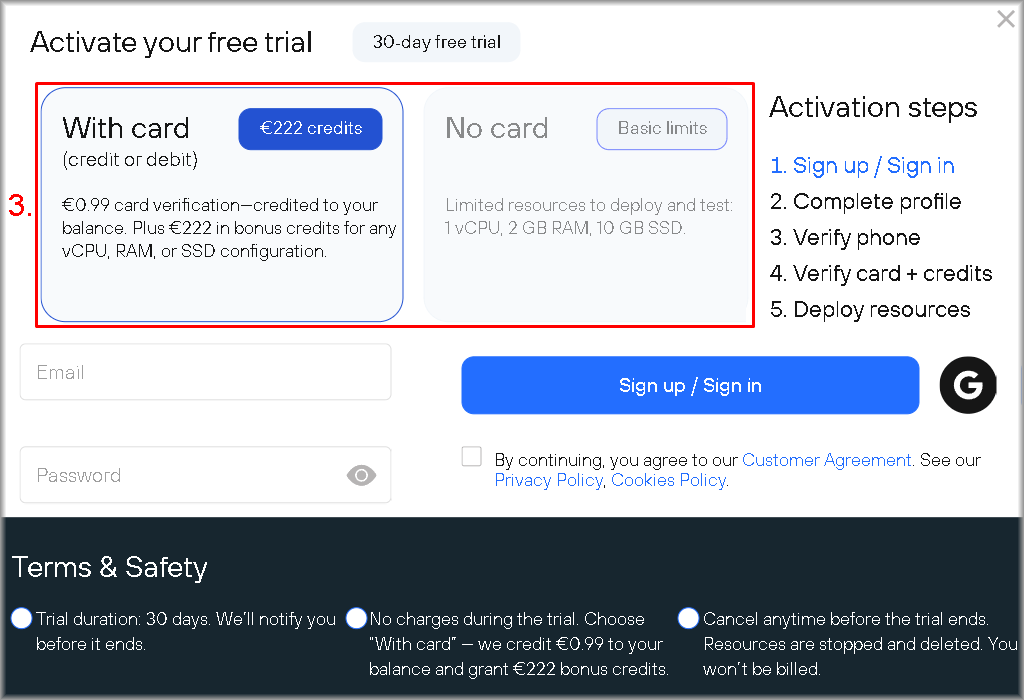 - “No card” – for the minimal configuration (1 vCPU, 2 GB RAM, 10 GB SSD) without linking a bank card.