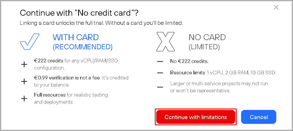 If you selected the “No card” option, a window describing the limitations of this free trial type will open. To continue, click the “Continue with limitations” button.