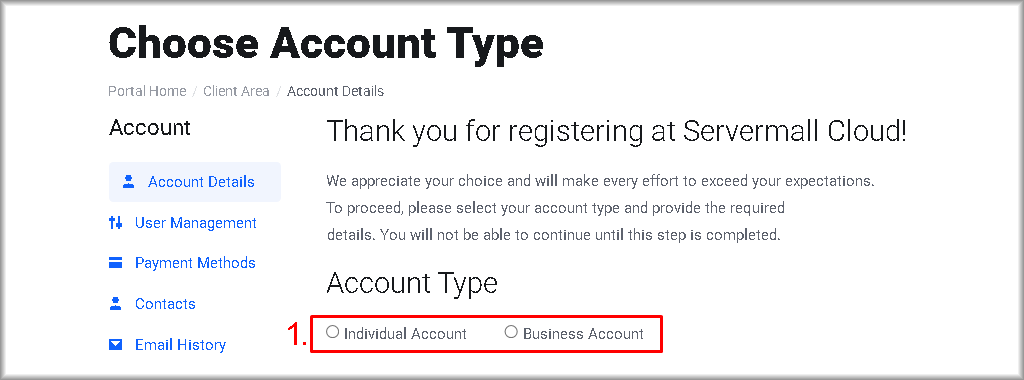 - “Individual Account” — if you plan to use Servermall Cloud services for personal purposes.