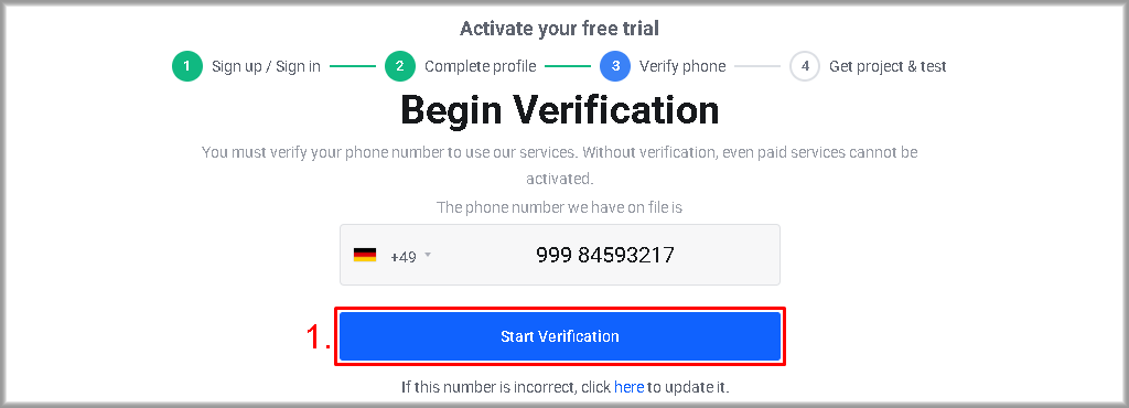 - Section IV – if you have filled in the profile, verified your phone number and selected the “With card” free trial type.
