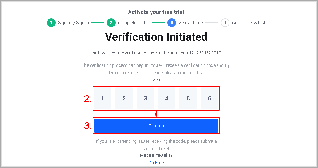 You can check the mobile phone number in the upper right corner of the “Verification Initiated” window. If the number is incorrect, click “Go Back“, then click the “here” link, correct the number, click the “Update number” button and return to step 1.