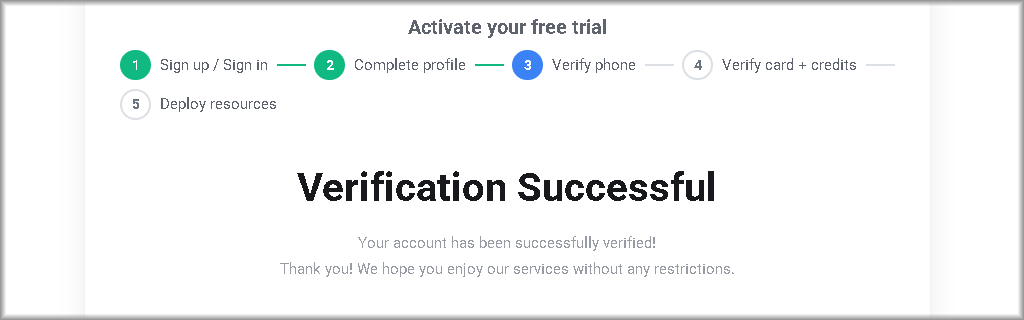 If you selected the “No card” free trial type, a trial project will be created automatically after verification and you can immediately proceed to Section VII to start using your project.
