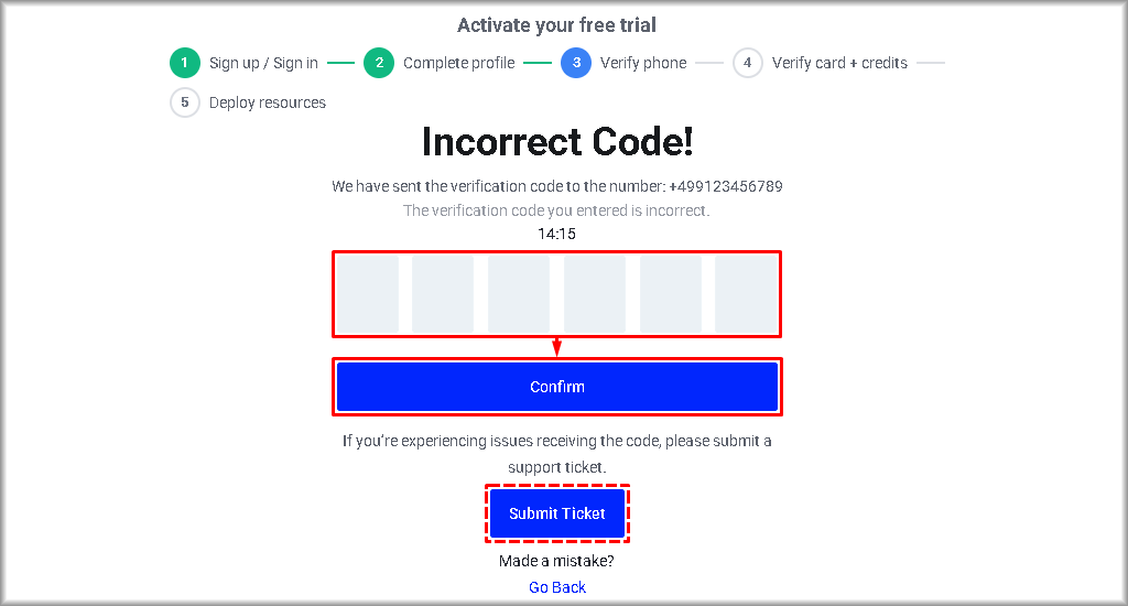 If you see the “Incorrect Code!” message, enter the code again and make sure that the verification code has been entered correctly, then click the “Confirm” button. If the verification still fails after you repeat the entry, click the “Submit Ticket” button and create a ticket for Support as described below in Section VI.