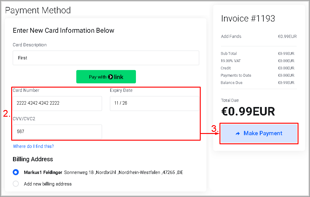 - Enter the details of the bank card that will be linked to the account and from which €0.99 will be charged and credited to your account balance. Enter the corresponding card data in the “Card number“, “Expiry Date” and “CVV/CVC2” fields.
