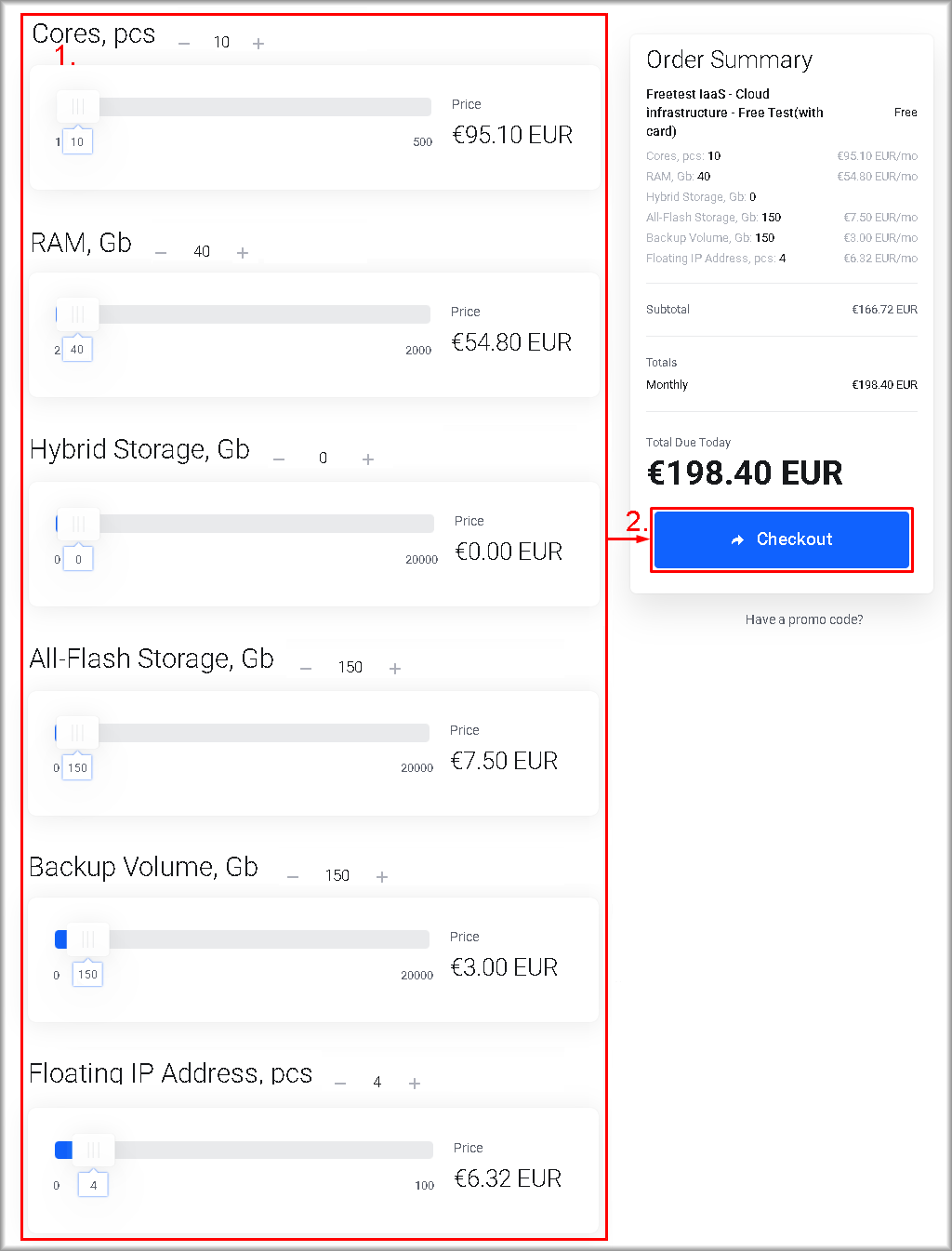 If you decide not to cancel your project after the trial period ends, the amount displayed in the “Monthly” field will be charged monthly from the linked bank card as payment for the cloud infrastructure. - Click the “Checkout” button.