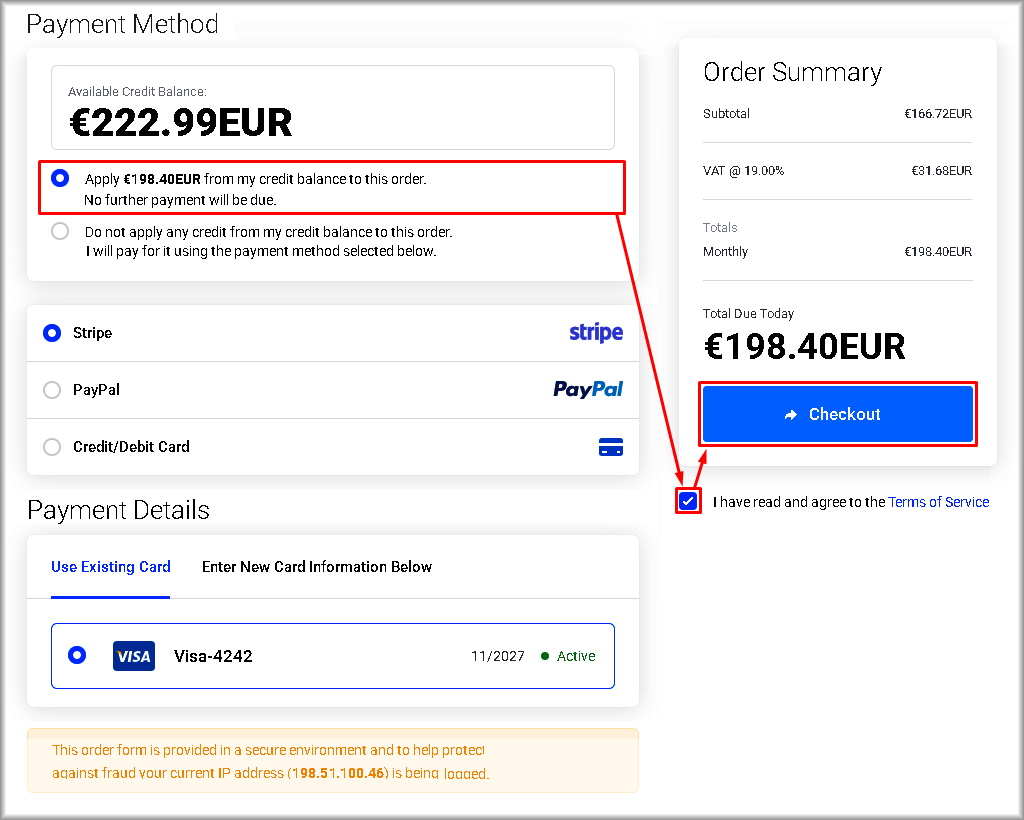 You will be redirected to the “Review & Checkout” page. - Select the “Apply €xxx.xx from my credit balance…” option so that the cloud infrastructure services are paid from your Servermall Cloud account balance, including deduction of the bonus funds.