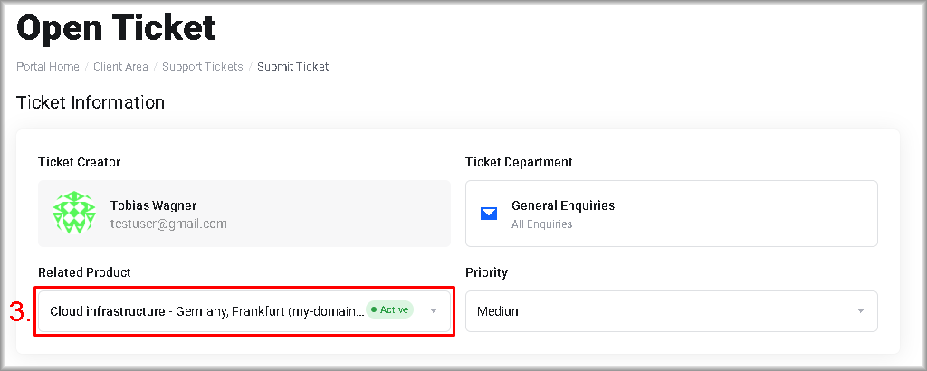 You will be redirected to the “Open Ticket” page. - Select from the “Related Product” list the service to which your request relates.