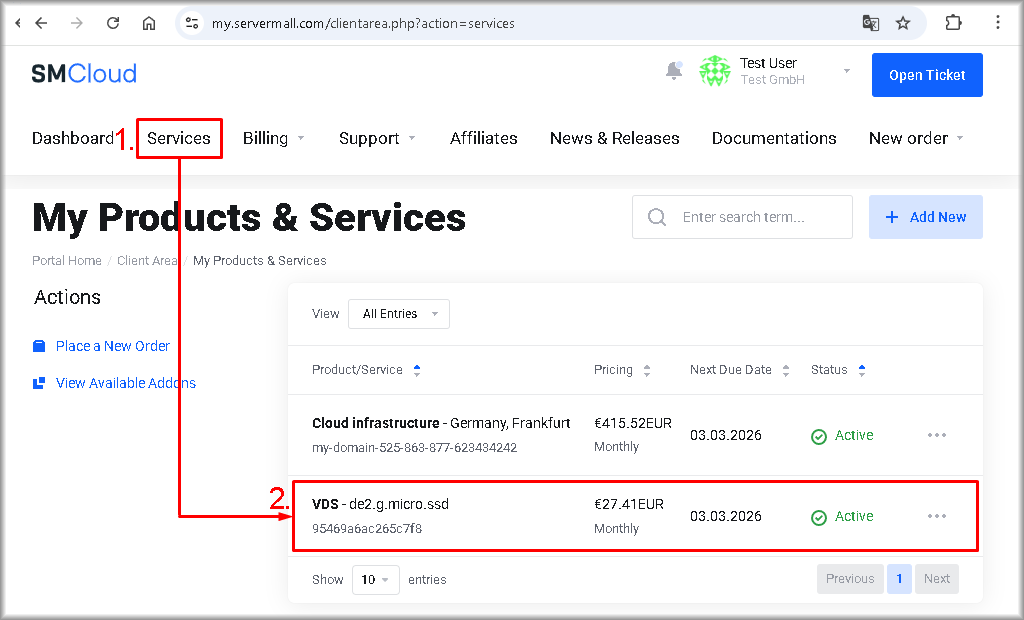 b. If 2FA is enabled, follow the guide “Signing in to the Control Panel Using 2FA“. - You must order a Servermall Cloud virtual machine. To order it, see the instructions: “How to Order a Virtula Machine”.