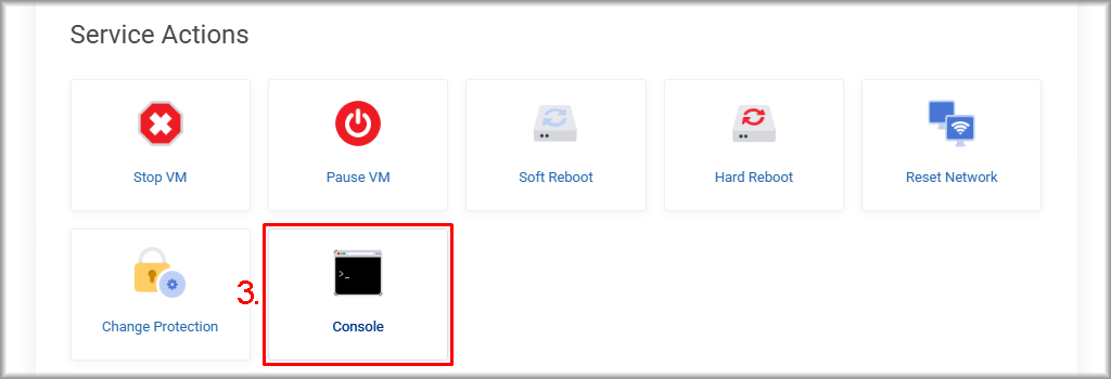 The control panel for the selected VM will open. - In the “Service Actions” section, click “Console“.