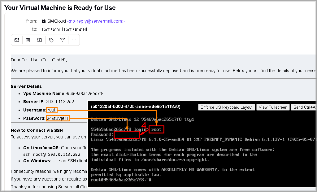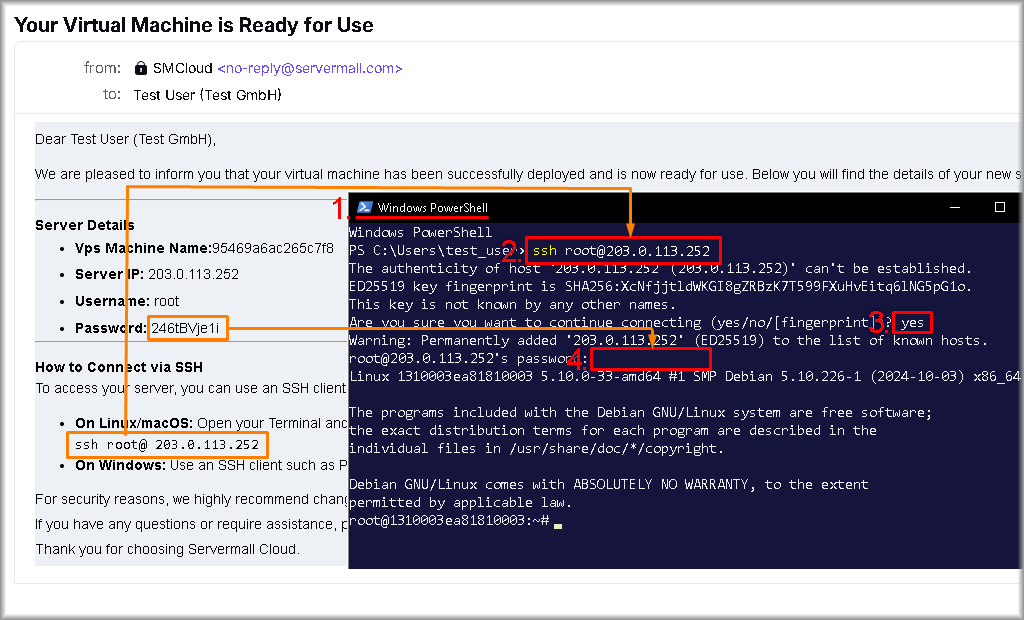 - In the Servermall Cloud email confirming that the virtual machine is ready, find the “How to Connect via SSH” section, copy the command shown there, paste it into your terminal/PowerShell, and press Enter.